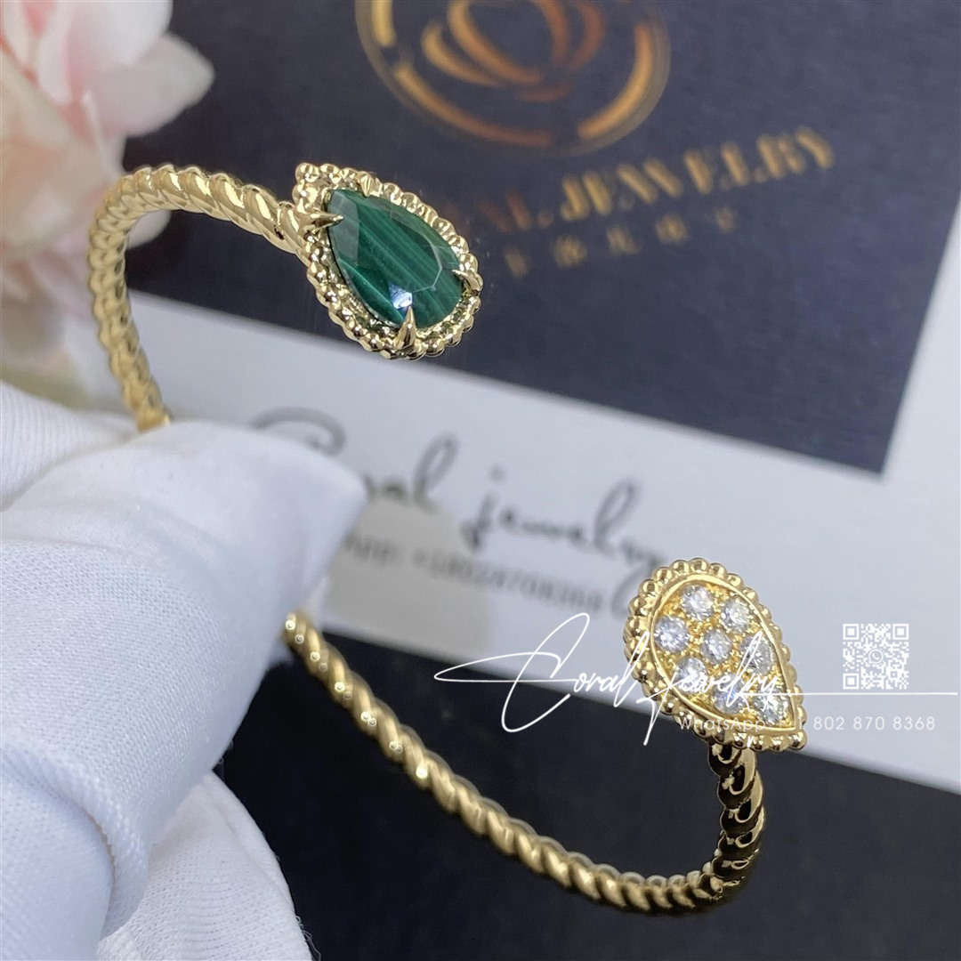 A sculpted chain twists voluptuously around the wrist. Here is a slightly open bangle bracelet, on which two Serpent Bohème drops are placed. Diamonds and malachite are also part of this sensual equation.